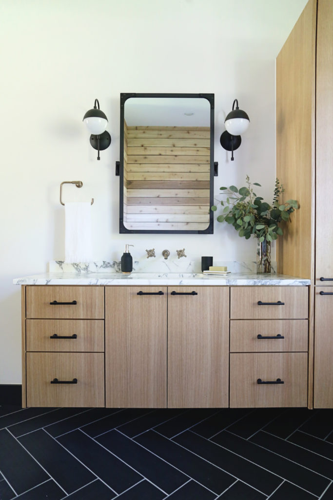 Aren’t those eucalyptus branches heavenly?? They give just the right vibe to this cozy modern bathroom! My sister and her bestie created them for us–find out more about their flower business here.